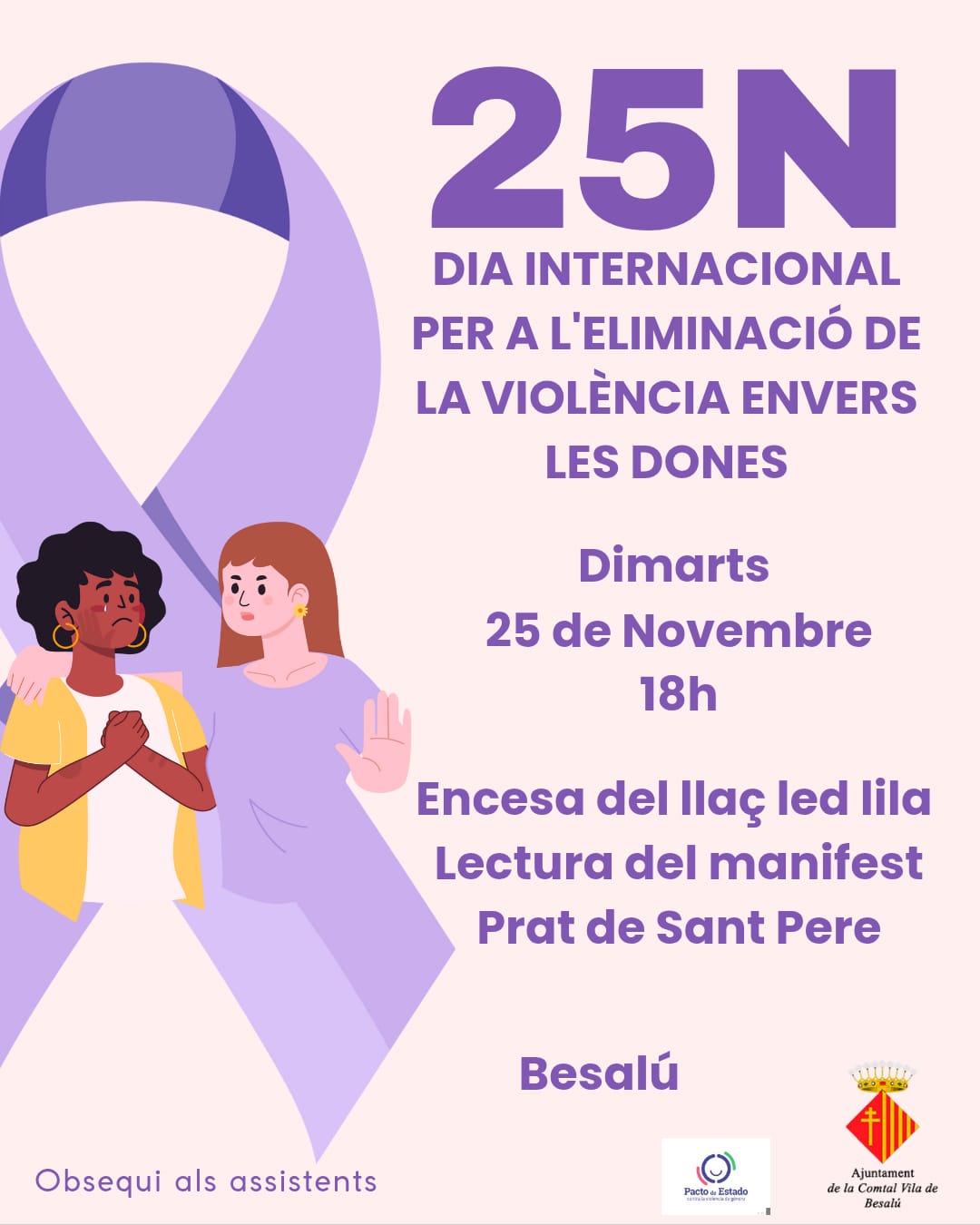 25N. Dia Internacional per a l’ eliminació de la violència envers les dones. T’esperem aquest dimarts a les 18h al prat de Sant Pere de #Besalú per recordar-les a totes. Lectura del Manifest i encesa del llaç lila, símbol del record.