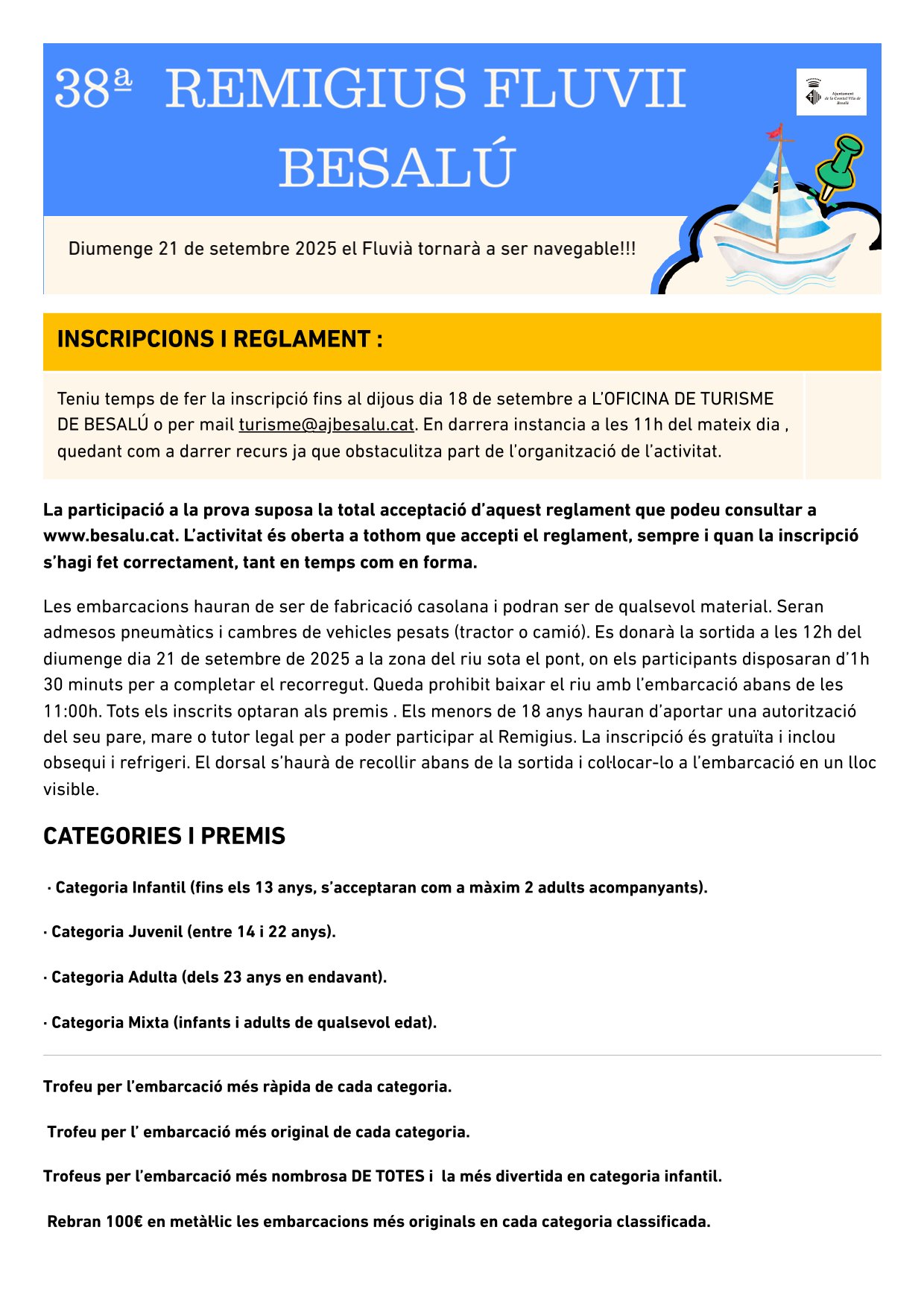 38 REMIGIUS FLUVII. Ajornat degut al mal temps de la data prevista durant la Festa Major, es farà el proper diumenge 28 de setembre a les 10h del matí.