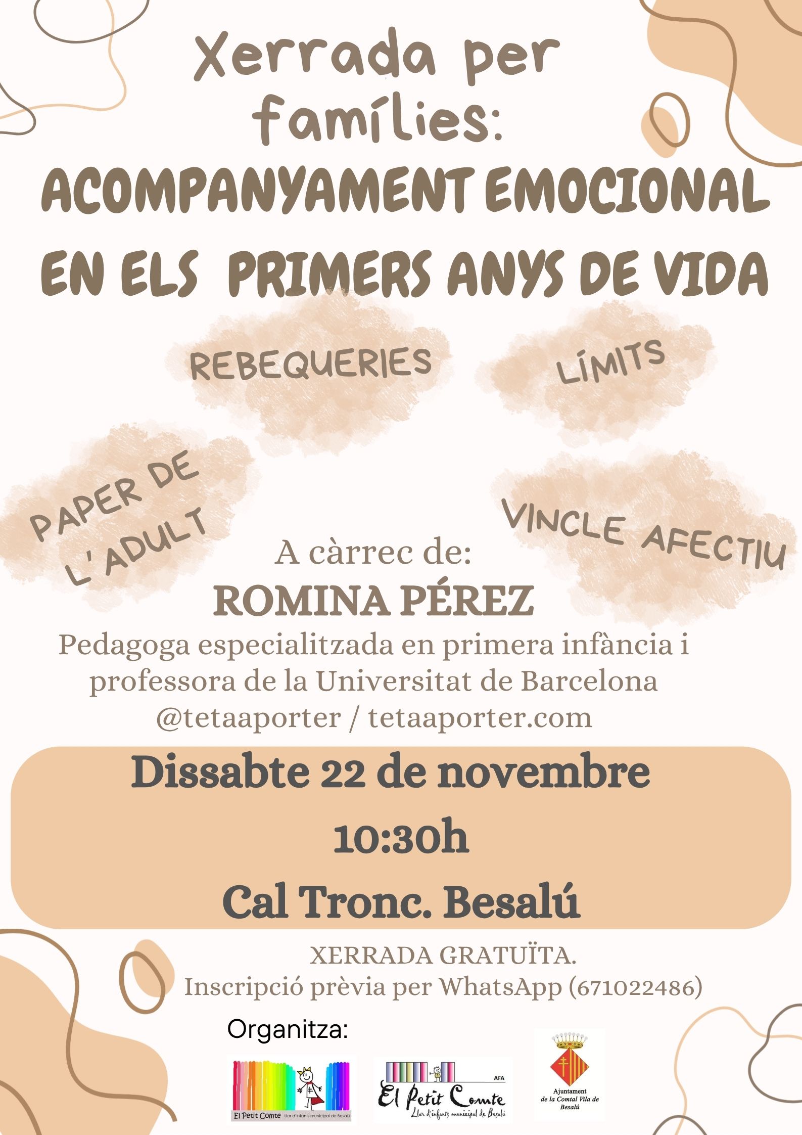 “Acompanyament emocional en els primers anys de vida”. Xerrada gratuïta per famílies a Cal Tronc el proper dissabte dia 22 de novembre a les 10:30h. A càrrec de Romina Pérez, pedagoga especialitzada en primera infància.