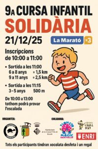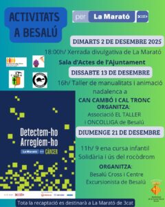 - Activitats previstes a #Besalú per @lamarato3cat: dissabte 13/12 taller de manualitats i animació nadalenca @eltallerbesalu i @oncolliga_besalu,14/12 Timbalers sensibilització cor i combos @emmbesalu i diumenge 21/12 cursa infantil solidària i ús del rocòdrom @besalucross @centreexcursionistabesalu. Tots els diners aniran per La Marató.
