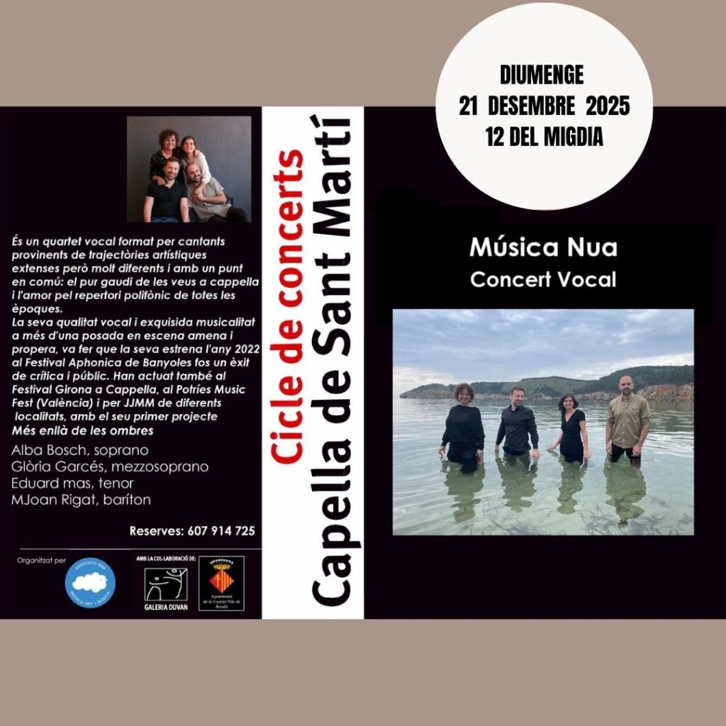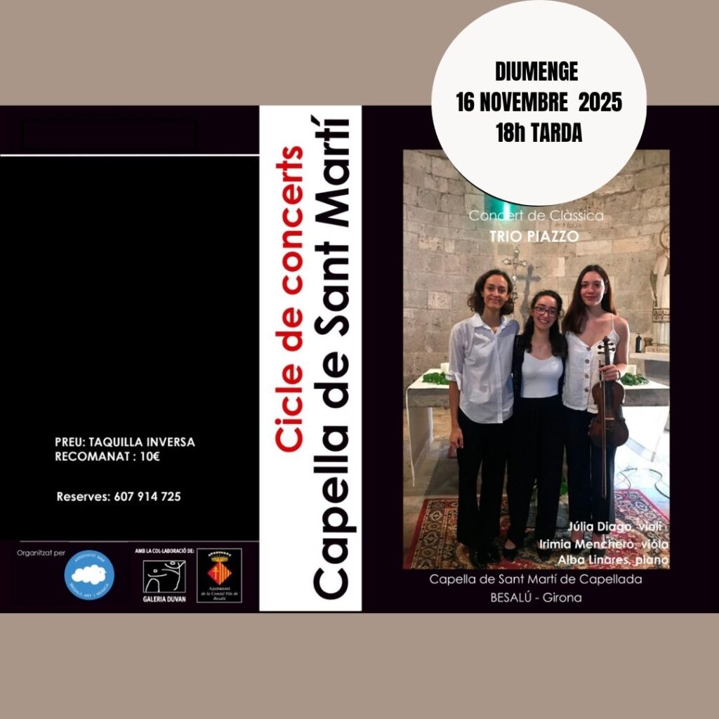 Concerts previstos a la Capella de Sant Martí pel 16 de novembre concert de clàssica amb Trio Piazzo i el 21 de desembre concert vocal amn Música nua . Taquilla inversa. Us hi esperem.
