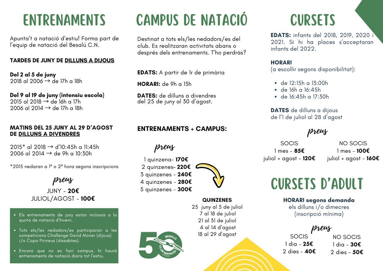 El Besalú Club Natació ja té a punt les activitats per aquest estiu 2025. Un any de celebració dels 50 anys del club. Inscripcions a la pàgina web www.besaluclubnatacio.cat