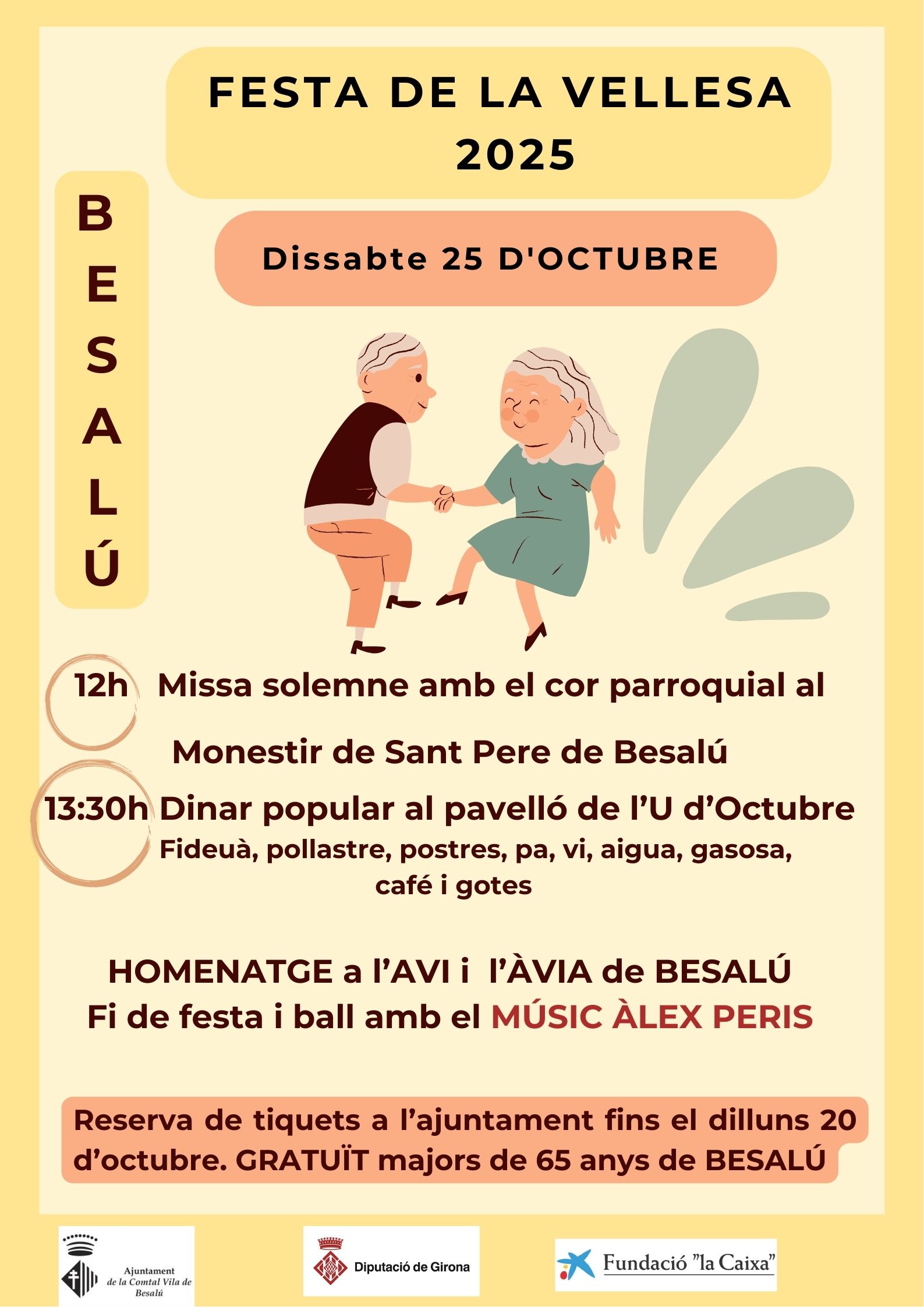 Festa de la Vellesa de Besalú, un dia dedicat a la nostra gent gran. Serà el proper dissabte dia 25 d’octubre amb l’homenatge a l’AVI i l’ÀVIA de Besalú 2025, ofici solemne, dinar popular i ball.