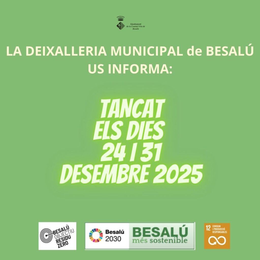 Actualitat La deixalleria municipal de Besalú tancarà el 24 i el 31 de desembre de 2025 24 i 31 de desembre de 2025 < Entrada AnteriorEntrada Posterior >