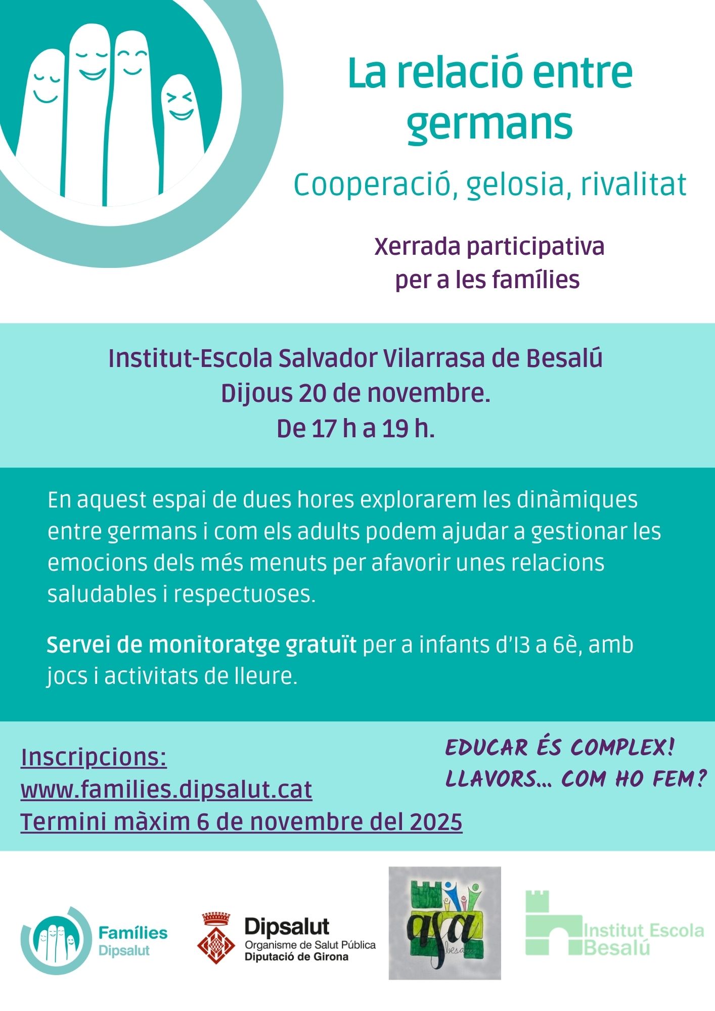 La relació entre germans. Cooperació, gelosia, rivalitat. Xerrada participativa per a les famílies. Dijous 20 de novembre de 17h a 19h a l’IE Salvador Vilarrasa de Besalú