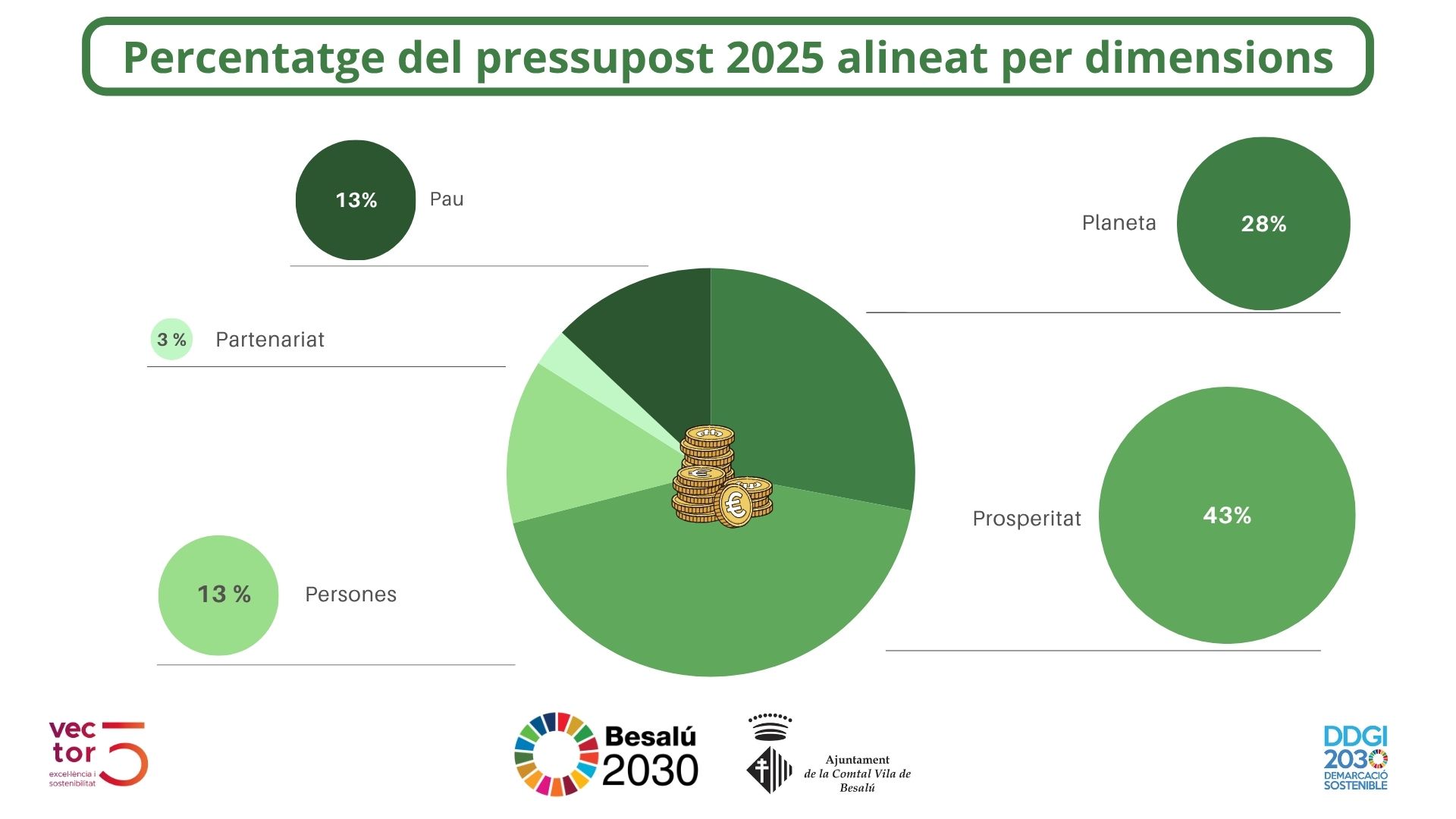 Les principals dimensions de treball són Prosperitat (56%), Persones (26%), Pau (19%) i Planeta (7%), un reflex d’un model de gestió municipal equilibrat i orientat al bé comú.