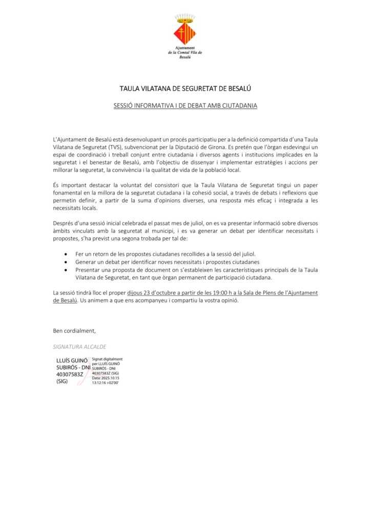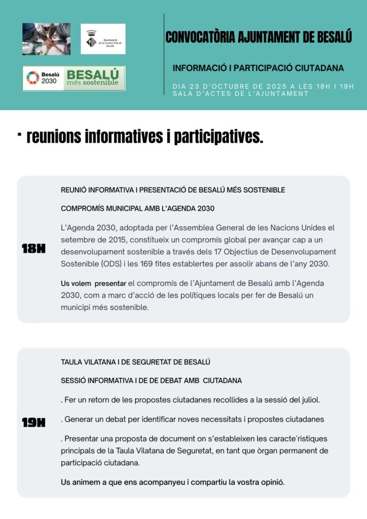 Sessió informativa i de debat amb la ciutadania. Taula Vilatana i de Seguretat. El dijous 23 d’octubre a partir de les 19h a la Sala d’actes de l’Ajuntament de Besalú . Us animem a que ens acompanyeu i compartiu la vostra opinió.
